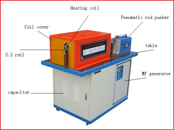 The furnace includes basically the SPZ medium frequency generator, the compensating cap, the working table, the heating coil, coil cover, rod feeder and so on.  For some applications, the infrared sensor, temperature controller and automatic rod feeding systems can also be included.