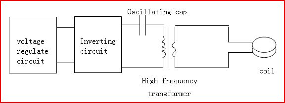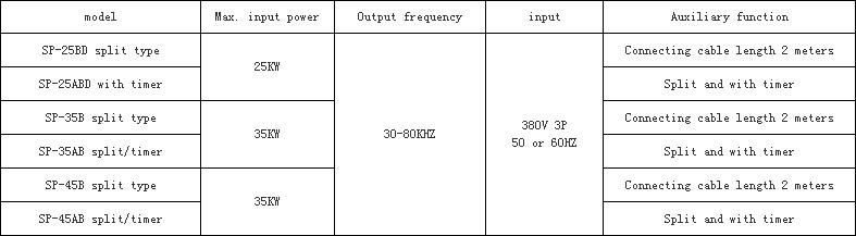 In SP-25BD, SP-35B and SP-45B series machines, series oscillating circuit is applied, through high frequency transformer, low voltage and high current power is output to go through the induction coil.