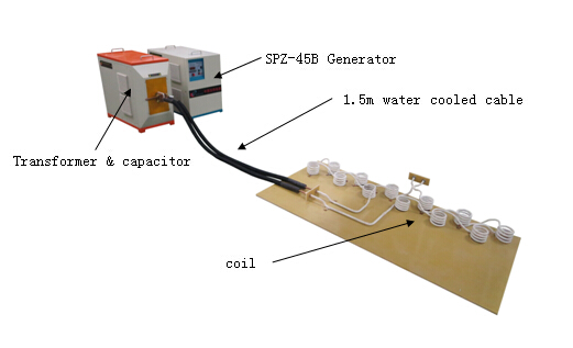 As the picture shows above, main is the MF generator, output unit is transformer and capacitor. Coil can be connected directly to the output unit, and can also be connected thought water cooled cable as shown in the below picture.