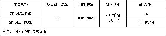 SP-04C系列設(shè)備結(jié)構(gòu)簡單、價格優(yōu)惠,振蕩頻率可達到250KHZ,在小零件的加熱中,有廣泛的應用;